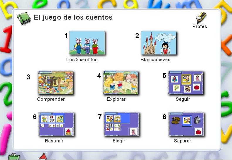 Se trata de una aplicación Web interactiva basada en los cuentos de los de Blancanieves y los tres cerditos. En una primera fase se escucha la narración del cuento acompañado de imágenes y posteriormente hay una serie de actividades interactivas para desarrollar las capacidades de comprender, explorar, seguir, resumir, elegir y separar. Va acompañad de una completa programación didáctica.